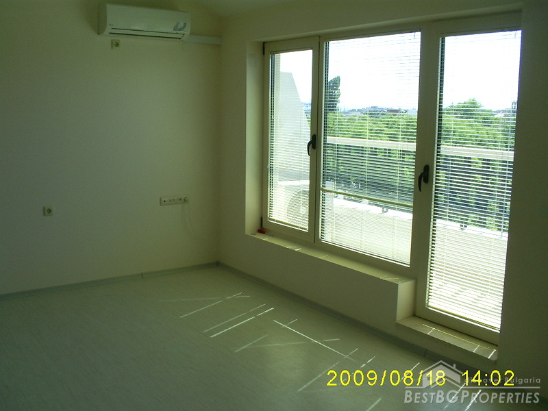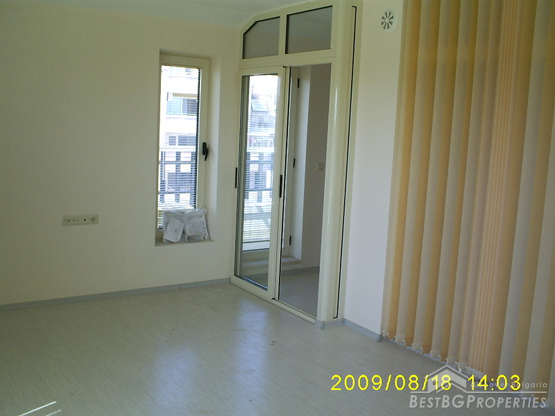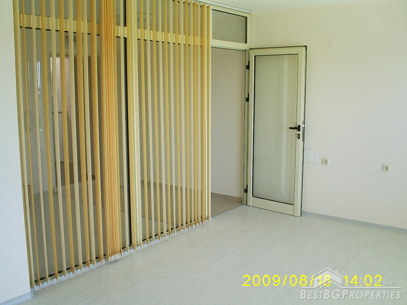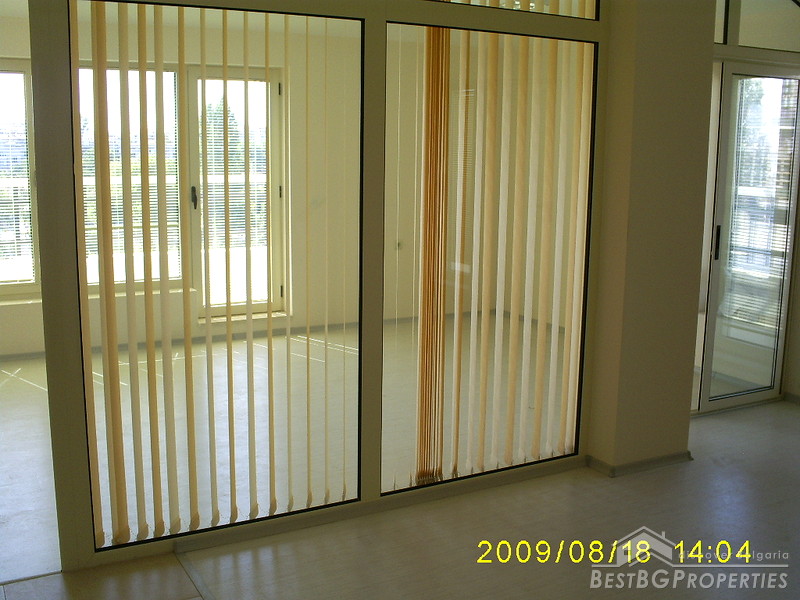 Have a look at our next offer. This is a large office for sale located in a newly built, luxury business building. The building is completely finished and has act 16. It has very interesting design, large panoramic windows with views towards Bourgas city. The office is 75 sq m large. The living area is distributed between two separate premises, kitchen box, corridor, bathroom with WC, large balcony with two faces and marvelous views. The office is situated on the 5th floor of the building. The office is for sale "on key" stage, finished with latex painted walls and ceilings, laminate floorings, terracotta in the kitchen box and balcony. The bathroom with WC is finished with terracotta and faience. The bathroom is fully equipped with everything necessary - sanitary equipment, shower cabin, sink, boiler. The window joinery is PVC. There is water and electricity provided. All switches and sockets are installed. There is also air conditioner and aspiration.