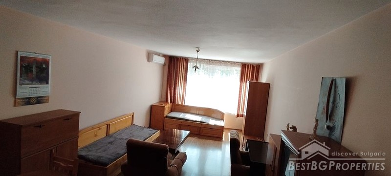 The property is in good condition. It is equipped with armored entrance door, PVC windows and insulation, laminate floors in all the rooms, granite tiles in the hallway and the kitchenette, terracotta and faience in the bathroom, plastered and latex-coated walls. The apartment needs slight refreshing repairs. It is equipped with air conditioning, furniture and electrical appliances.
