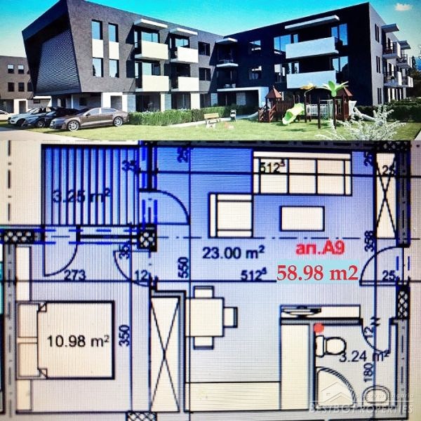 The apartment consists of an entrance hall, a living room with a kitchenette, a bedroom, a bathroom with a toilet and a balcony. There is also a basement. The total living area is 56 sq m.
