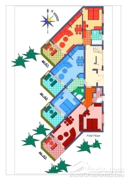 The complex consists of luxury villas and apartments designed in the traditional Bulgarian monastery style. Each villa will have its own garden with shrubs and flowers. Owners will enjoy good-sized bedrooms, airy living areas, spacious kitchens and pretty terraces. The vertical planning allows each villa and apartment to be facing south towards Sunny Beach and the bay of The Old Nessebar. In addition every house will have private entrances, spiral staircase, charcoal BBQ, own patio and air conditioning. The family oriented villa and apartment complex guarantees accommodation of the highest standard for more discerning rental market or private investor. The interior will be kept to the highest quality standards and buyers will have the opportunity to choose between several furniture types to ensure personal taste met.