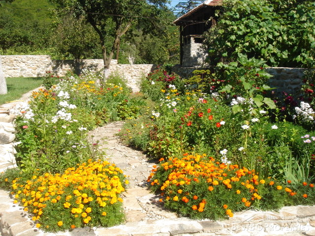 A 400 sq m yard adjoining a river, a solid fence-stone wall and hand-made wooden beams, landscaping, stone pavement;