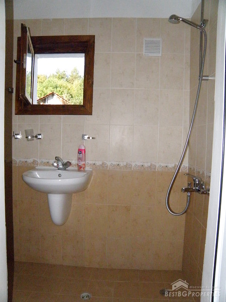 -The firs house is suitable for 5 + 3 people. It is two-storey with a total built-up area of 125 sq. M. The house is massive, brick built with additional outside insulation of gypsum and internal gypsum cardboard. The windows and doors are massive-wooden, the floor is wooden flooring. It consists of three rooms. One of them is with a bed and a half and the other two are with one double bed and one extra (extendible bed). One of the rooms has a fireplace and satellite TV. The house has a shared bathroom. On the ground floor, which is grounded, there is a gym and cellar. The heating is with electrical convectors.