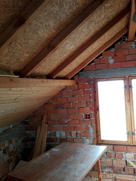 The villa not completed entirely. The second floor still needs some work. The building has finished external isolation, internal bathroom with toilet and a closet. It consists of one room, a kitchen box and a vestibule on the first floor. On the second floor, there is a large terrace and an attic premise. All window frames are wooden. The total size of the house is 30 sq m.