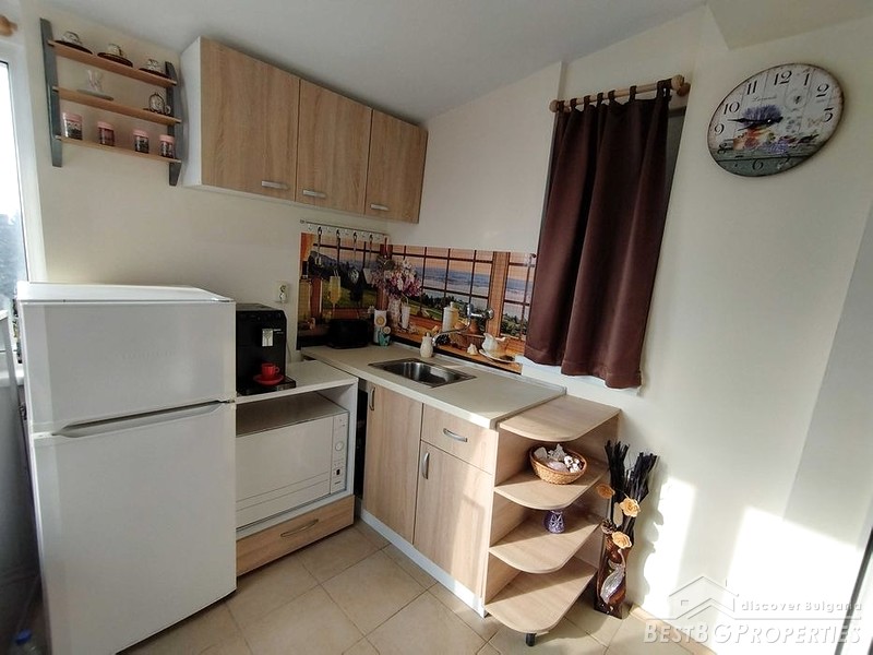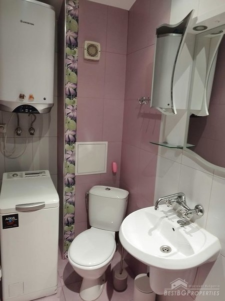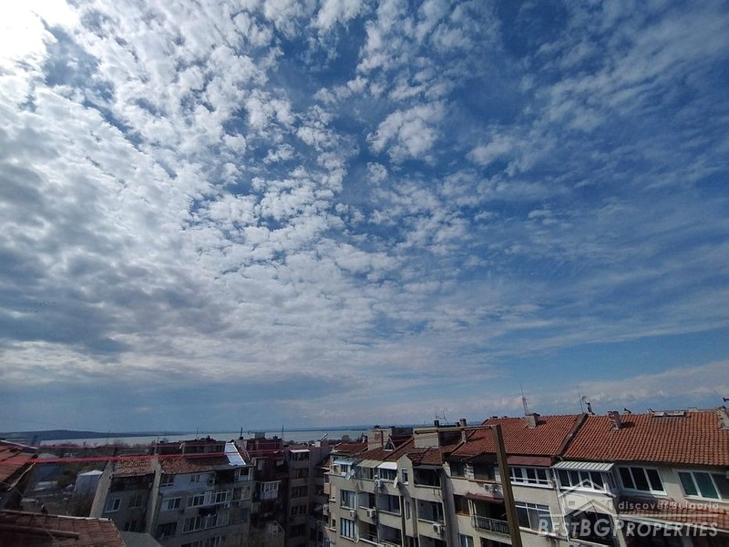 The apartment consists of an entrance hall, living room, bedroom, bathroom with toilet, a kitchen, and a spacious terrace with a view of Lake Burgas. It is on the 7th floor of the building, with elevator access. The price also includes a basement.