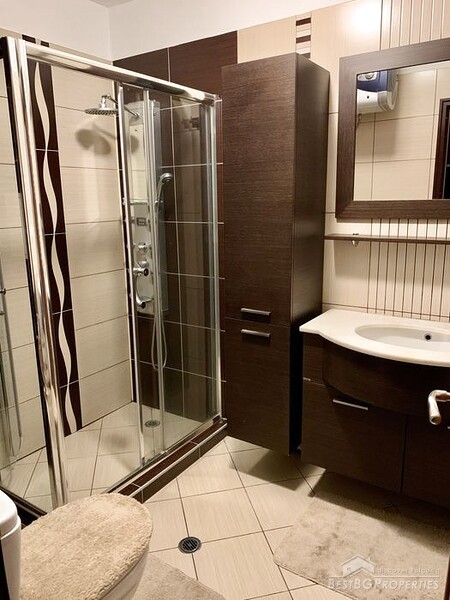 The apartment is fully furnished and equipped, ready to move in, without the need for additional investments. It features a modern kitchen with granite countertops, built-in appliances (oven, hob and dishwasher), extractor hood and refrigerator, a comfortable dining area, a comfortable sofa and a 50-inch TV. The bedroom is spacious (18 sq.m.) and has a separate office area, suitable for working from home. The bathroom is stylishly designed and equipped with a hydropanel, and heating and cooling are provided with two Mitsubishi air conditioners. In the hallway there is a huge wardrobe and a separate storage room with a washing machine and space for a dryer. The terrace is a loggia type, spacious, with granite tiles and a glass railing.