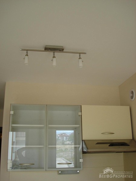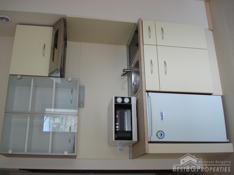Have a look at our next offer. This is a studio apartment for sale located in a nice residential complex in the town of Bansko. The apartment is a studio type and comprises total living area of 33 sq m. The living area is distributed between a living area with kitchen box, a bathroom with WC and a corridor. The apartment is located on the second floor of the building. It has south exposure with magnificent views towards the complex and the mountain and the ski tracks. The apartment is fully furnished.