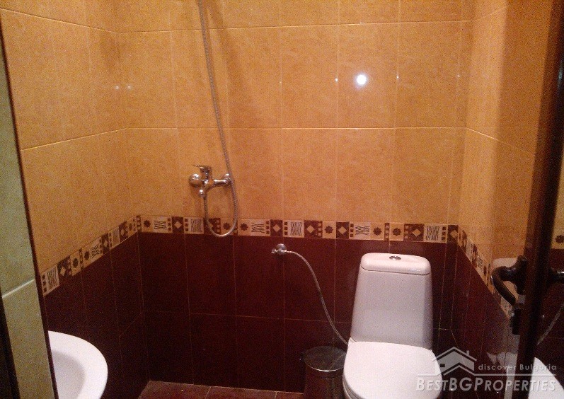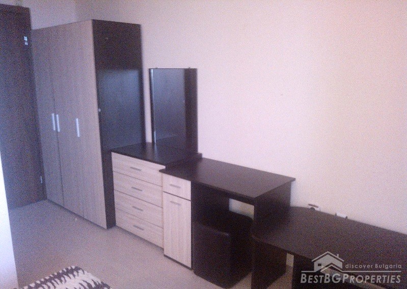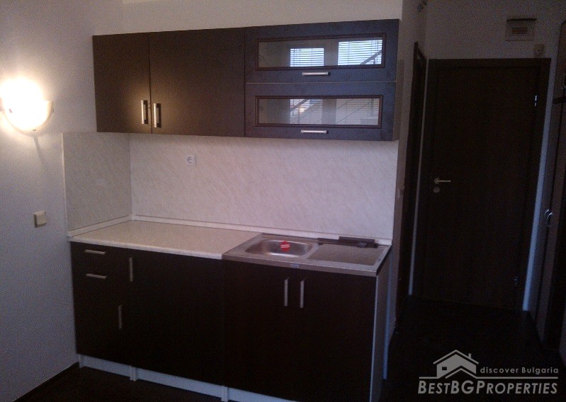 The offered apartment has total living area of 21 sq m. It is on the ground floor and consists of one room with kitchen box and a bathroom with WC. The price includes full furniture and equipment – air conditioning, kitchen cabinets, mini fridge, sofa, wardrobe, desk, dresser, shutters, etc.