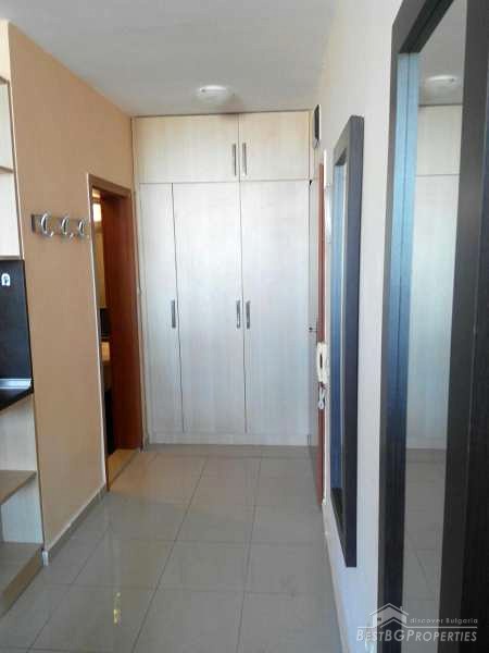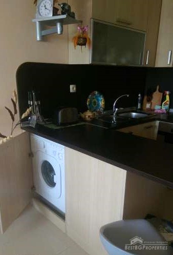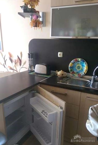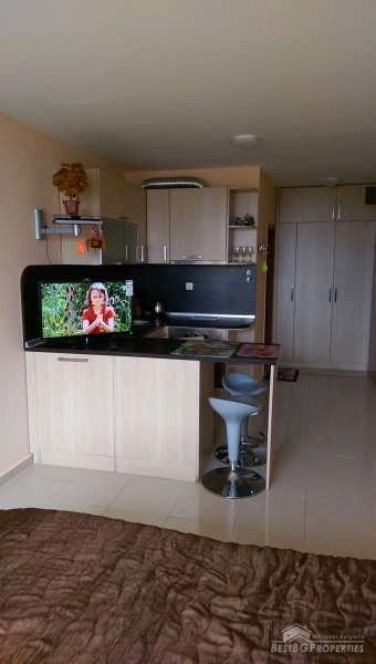 The studio is luxury furnished and equipped. It has total living area of 34 sq m and consists of one room with kitchen box and sleeping area. The sleeping area overlooks the sea and benefits with large double bedroom. The kitchen is fitted with all electrical appliances – oven, hob, extractor, fridge, washing machine, etc. There is also a spacious bathroom with shower cabin and WC and a balcony with amazing sea view.