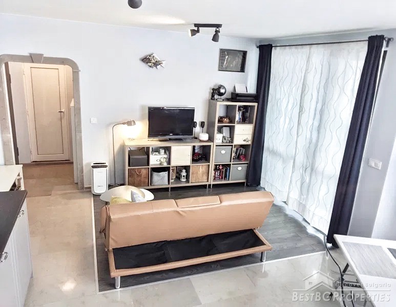 The property has the following functional distribution - spacious living room with access to a glazed terrace, one bedroom, bathroom with toilet and corridor. The kitchen is equipped with all necessary appliances - refrigerator, oven, ceramic hob, extractor and dishwasher, washing machine with dryer. The terrace is glazed, can be used as a gym or an office. The apartment is equipped with an armored front door and security system. There is also a personal storage space next to the front door.