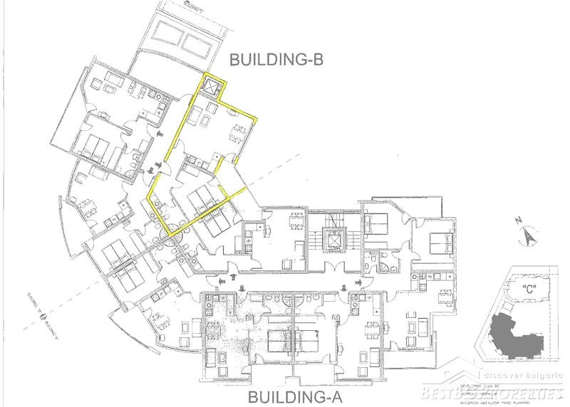 The apartments are same type - one bedroom with total living area of 75 sq m. The first one is situated on the third floor of the building and the other one - on the last, 5th floor. Each apartment consists of a lounge, living room with kitchen area, one bedroom, bathroom with WC and a balcony with outstanding views towards the swimming pool and the resort.