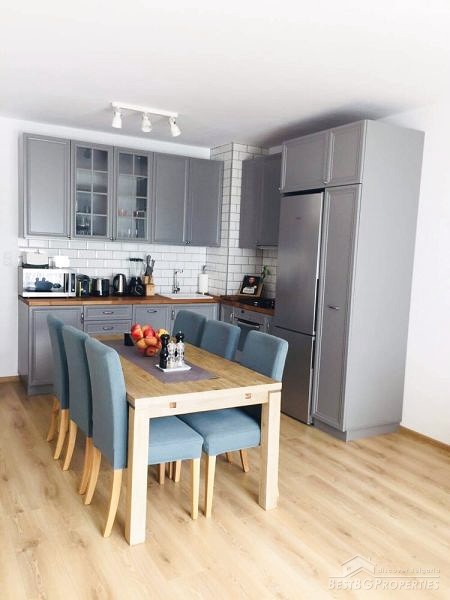The apartment consists of an entrance hall with a corridor, a bathroom with a toilet and bathtub, a second toilet with a laundry room, a living room with a kitchen box, one bedroom, children's room and a large terrace with view of the Vitosha Mountain and the inner yard of the complex. The property is luxury finished and equipped with high class electric appliances and furniture - the kitchen countertops, dining table and cupboards are made of solid wood. The floors are made of Spanish granite and high quality laminated parquet.