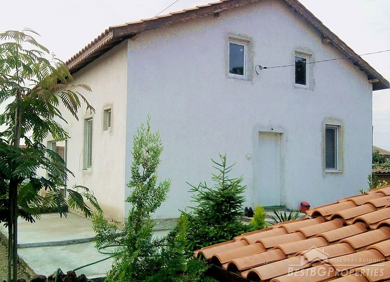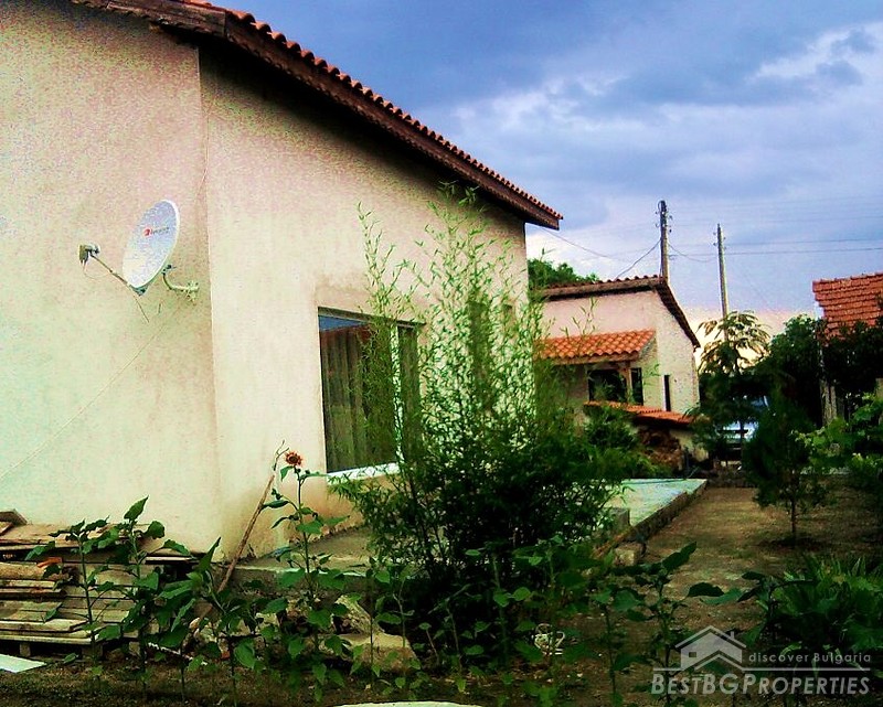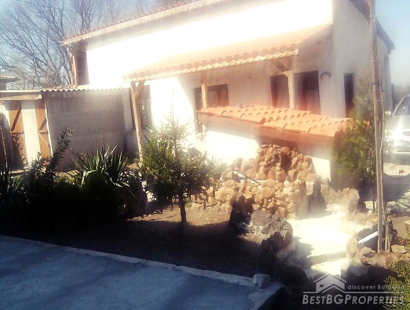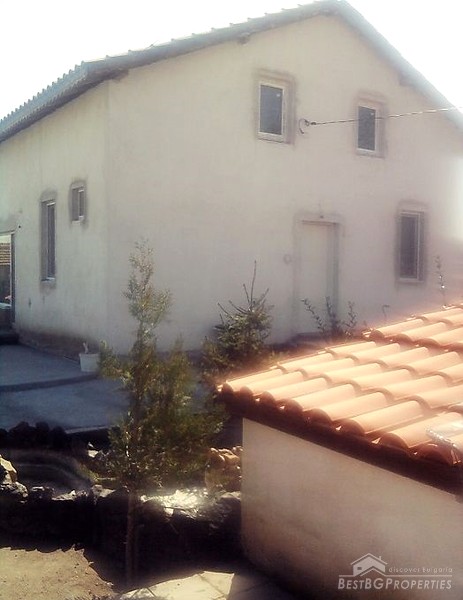 The construction was finished a year ago. There are aluminum windows, laminate floorings, terracotta and stone decoration. The yard is very spacious. At the back side it is possible for growing vegetables and upfront there is a garden with fruit trees, pines and a fountain. There are all communications - electricity and water. Both houses are inhabited at the moment.