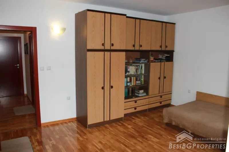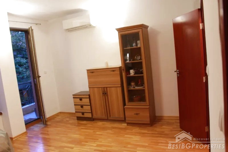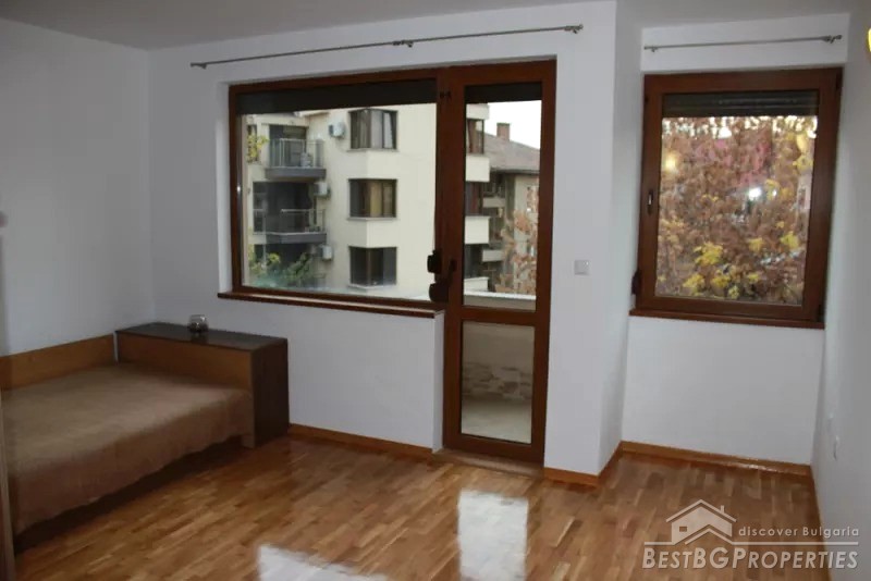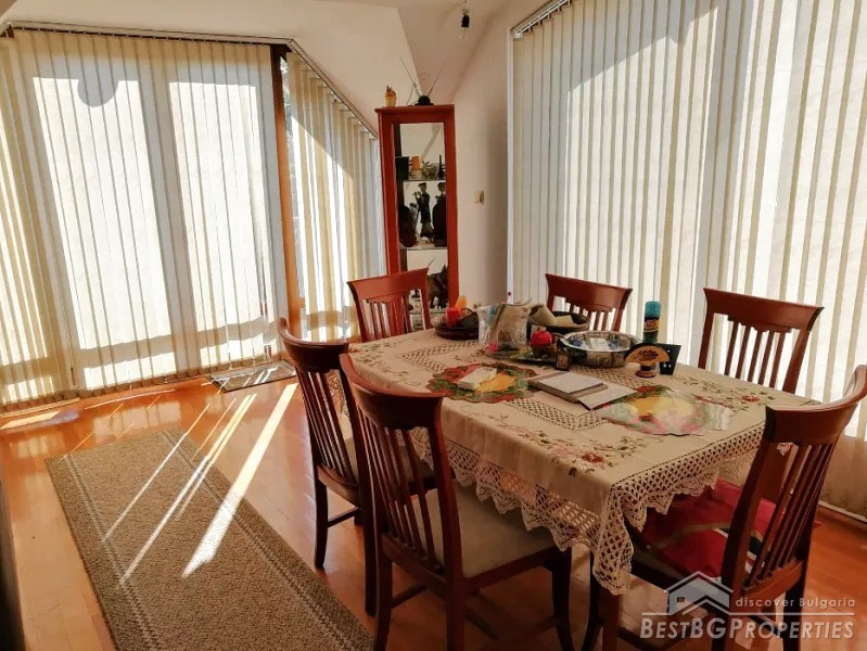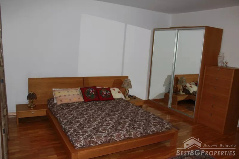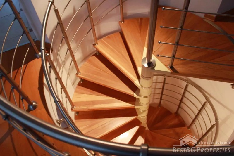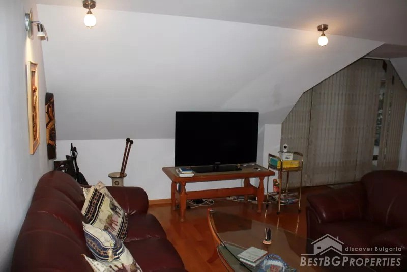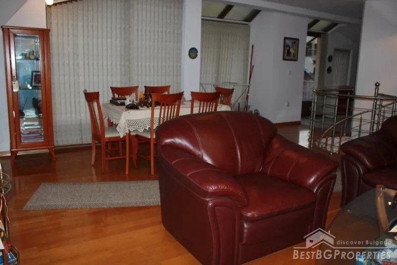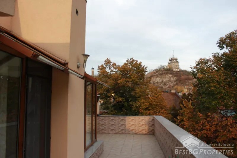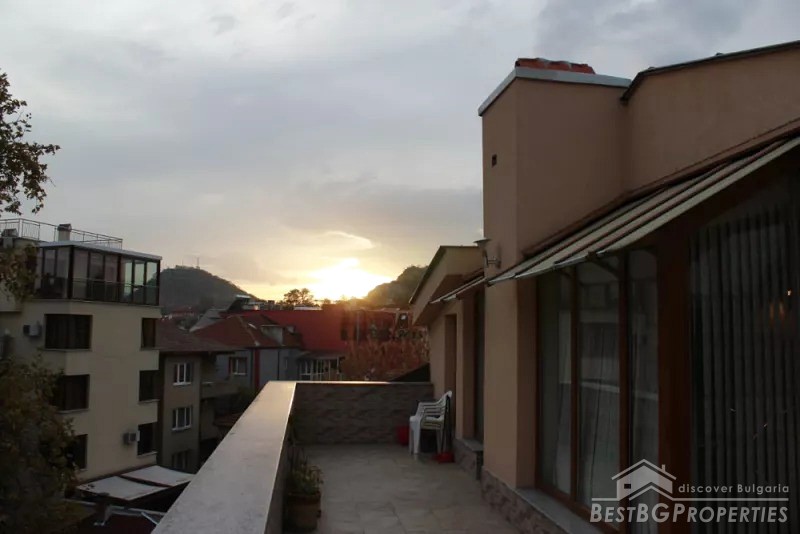 The apartment is on the fourth and fifth floor with a unique view of the Plovdiv hills. Its total living area is 223 sq m. It is fully air-conditioned, furnished. On the first level, there are three spacious and bright bedrooms with two large bathrooms and toilets fully equipped and finished. One of the bedrooms has a walk-in wardrobe. Upstairs there is a large living room, dining room, fully equipped kitchen with panoramic window to Bunardzhika, and a door to a large south terrace overlooking the all four hills - Sahat Tepe, Danova Hill with the TV tower, Bunardzhika and Youth Hill. Upstairs there is also a toilet with a sink and small terraces to all rooms.