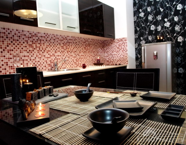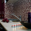 - Kitchen with hob, fridge, cupboards, crockery, tabel with leather back chairs all fittings and finishings