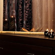 - Living room with leather sofas, coffee table, TV cabinet, TV, Book Shelves, Lamps, curtains fittings and finishes.