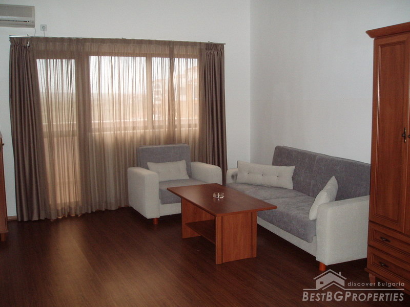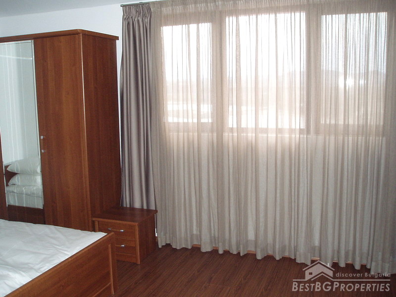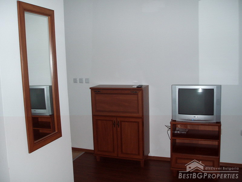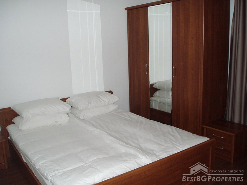 The apartment is completely furnished, 80 sq m and consists of entrance hall, living room with an open kitchen, bedroom and bathroom. It is located on the fourth floor and enjoys beautiful sea view. The suite is ready to move in and no additional furnishing is necessary. The bedroom has double bed and bedding, wardrobe, cupboards, chest of drawers, mirror, TV set and finishes. The bathroom is supplied with bath, shower and all fittings. The kitchen has hob, fridge, cupboards, table with four chairs and all fittings. In the living room there is a sofa, arm-chair, coffee table, wardrobe, lamps and curtains. Air conditioner is available.