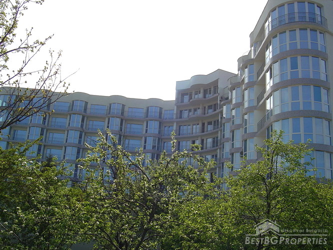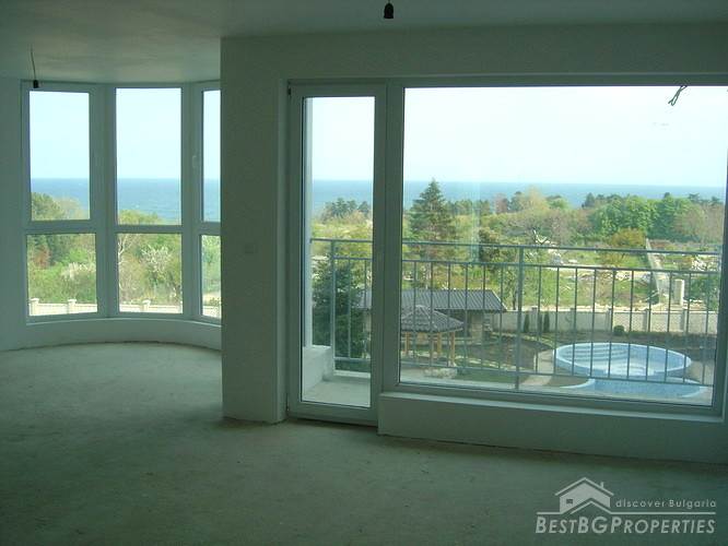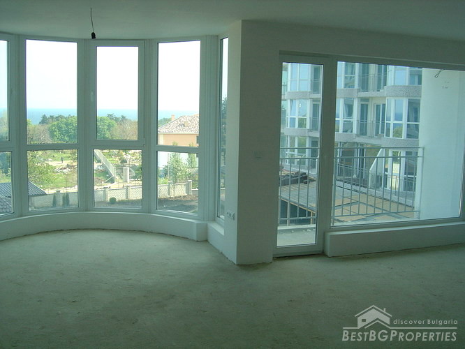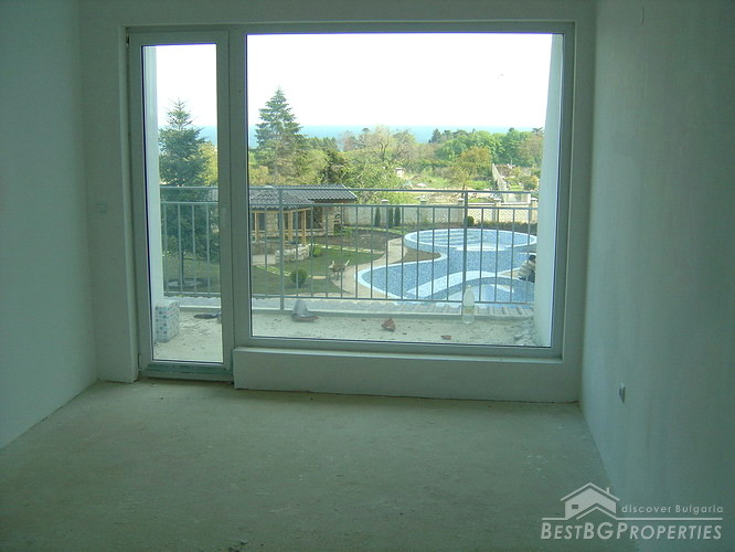 We offer you a marvelous messonette in a modern building just 6 km far from second largest city in Bulgaria – Varna. The apartment is situated in Saint Constantine and Elena resort only 300 m from beach. It consists of 3 bedrooms, 2 bathrooms, with small balcony and a huge dining room with kitchen – all spreading over 175 sq m total living area. The apartment is finished with rough plaster and needs flooring, painting and proper furniture. It is situated on the top floor overlooking the garden, the pool and offering beautiful sea view.