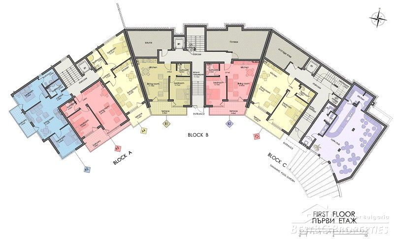 The complex we offer to invest in is designed and finished by leading developing company. What’s most important is that it is already completed and ready to use. The development includes 6 floors with 47 one and two bedroom apartments with living area from 66 sq to 114 sq m. The total living area is more than 4000 sq m. There is also swimming pool in front of the building, also fitness gym, sauna, cocktail bar, restaurant and parking lot available for the owners and guests of the complex.