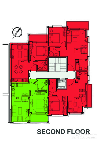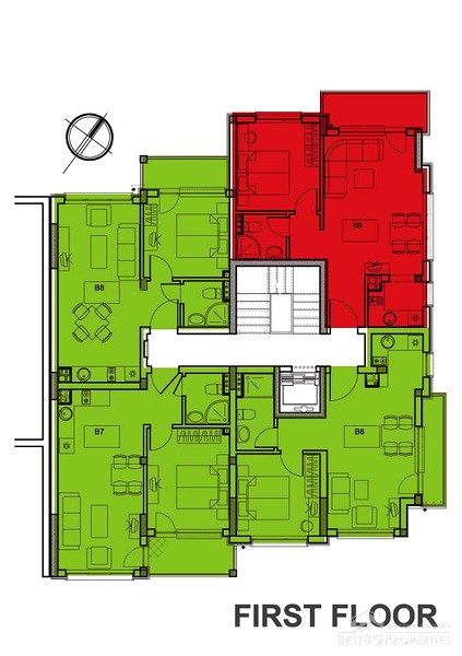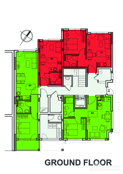 - Apartments' layout: an entrance hall, a toilet and a bathroom, a living room with a kitchenette and a dining area, and one or more bedrooms
