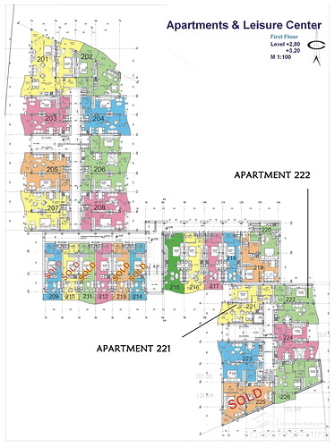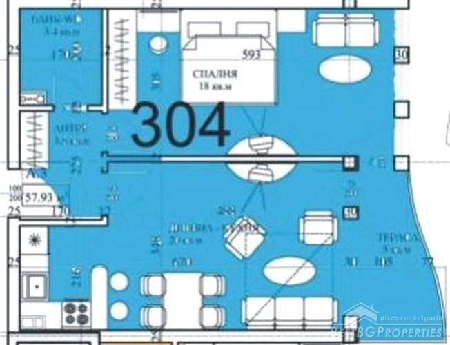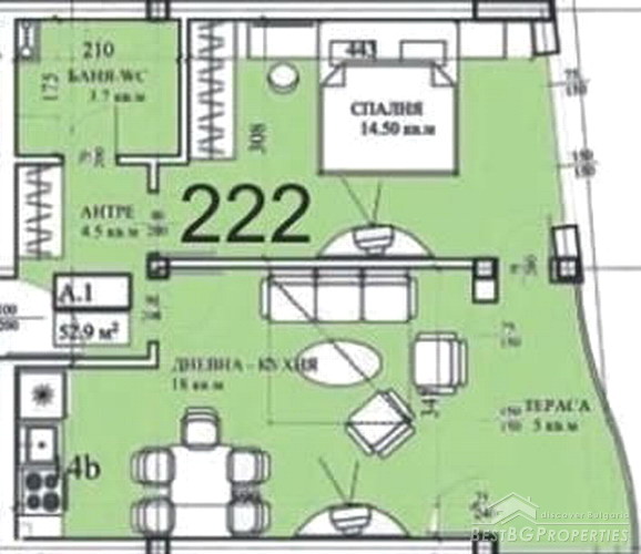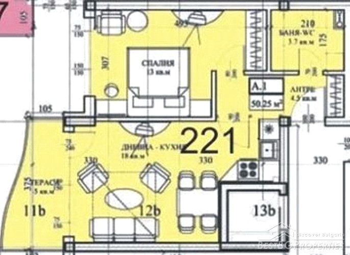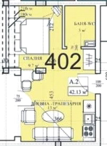 Consist of: entrance hall, living room – kitchenette – bedroom in one open area, bathroom/WC and balcony.