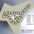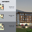 The apartment complex covers 90 studios and 18 apartments. The entrance level in the apartment complex provides 10 parking places, while the first underground ground floor is designed as a parking lot for 19 cars and accessible by an open circle ramp.