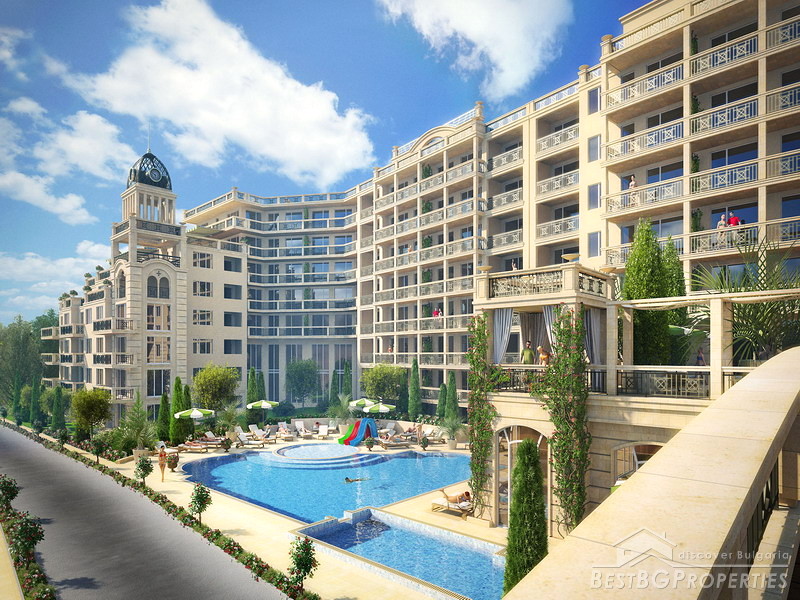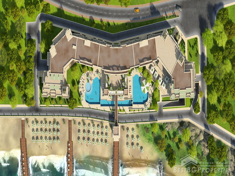 The development consists of 6 sections, each with separate entrances and lifts. The sections are multilevel and follow the slight inclination of the plot. The buildings, apartments and facilities will be executed with highest quality finishing materials to provide unmatched luxury for its residents. Beautiful landscaped green garden with a huge 3-level swimming pool separates the complex from the sandy beach just meters from it.