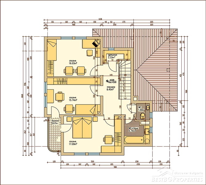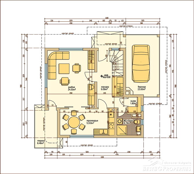The houses are same type two storey buildings with total living area of 174 sq m and individual garden of 500 sq m. The first floor includes large open area /living room with dining room and kitchenette/ as well as corridor, bathroom/WC, closet and garage all spreading over 90 sq m. The second floor comprises 84 sq m distributed between three bedrooms, bathroom and toilet. Two of the bedrooms have common terrace.